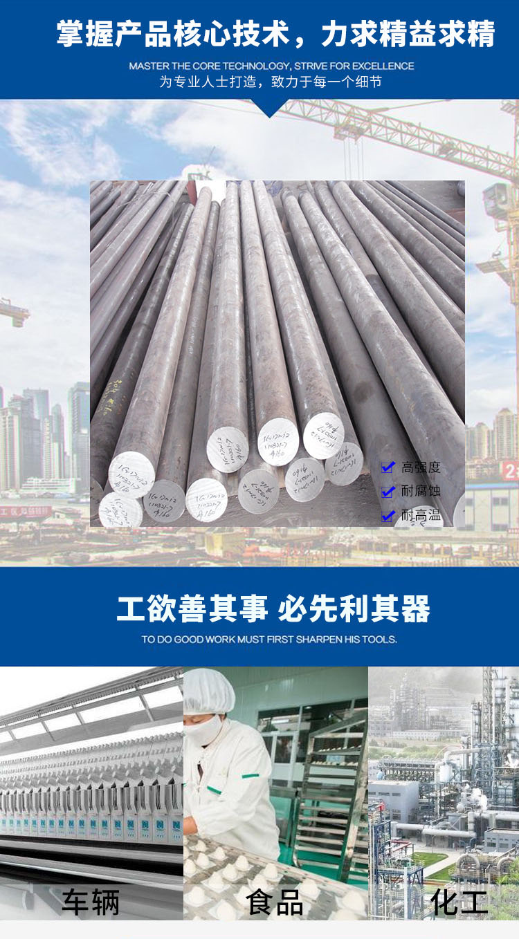 316不銹鋼棒應(yīng)用前景廣闊,被廣泛用于五金廚具、造船、石化、機(jī)械、醫(yī)藥、食品、電力、能源、建筑裝潢、核電、航空航天、軍工等行業(yè)!。海水里用設(shè)備、化學(xué)、染料、造紙、草酸、肥料等生產(chǎn)設(shè)備;食品工業(yè)、沿海地區(qū)設(shè)施、繩索、CD桿、螺栓、螺母。316不銹鋼棒按生產(chǎn)工藝分可分為熱軋、鍛制和冷拉三種。熱軋不銹鋼圓鋼的規(guī)格為5.5-250毫米。其中:5.5-25毫米的小不銹鋼圓鋼大多以直條成捆供應(yīng),常用作鋼筋、螺栓及各種機(jī)械零件;大于25毫米的不銹鋼圓鋼,主要用于制造機(jī)械零件或作無(wú)縫鋼管坯。316不銹鋼棒分為316L不銹鋼圓棒,904L不銹鋼方棒,904L不銹鋼光亮棒904L 國(guó)內(nèi)牌號(hào)00Cr20Ni25Mo4.5Cu.隨用途而異。C含量<=0.02%或0.03%.具有較高的鉻含量和足夠的鎳含量,銅的加入使它具有很強(qiáng)的抗酸能力,尤其對(duì)氯化物間隙腐蝕和應(yīng)力腐蝕崩裂有高度抗性
